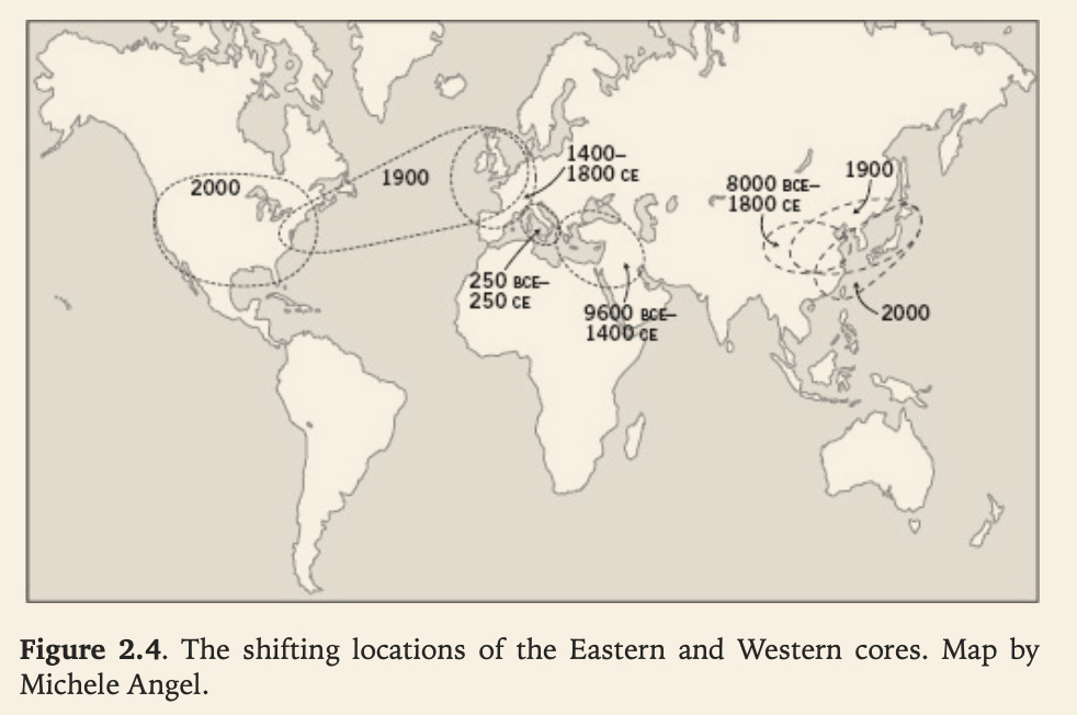 Morris slightly prioritizes geography over culture as the primary engine of historical dominance. This emphasis is grounded in sound reasoning, but arguably underestimates the reciprocal influence of culture upon environmental adaptation. Contemporary phenomena, such as cultural conflicts unfolding independently of material constraints, suggest a more complex interplay than Morris allows. Still, his environmental framing offers a coherent narrative for the long-term divergence between East and West: and it is mostly a question of „what are the proportions in the mix?“. What strikes me as more interesting and problematic is complete lack of any interaction with the concept of institutions, mostly popularised by Acemoglu (Why Nations Fail)